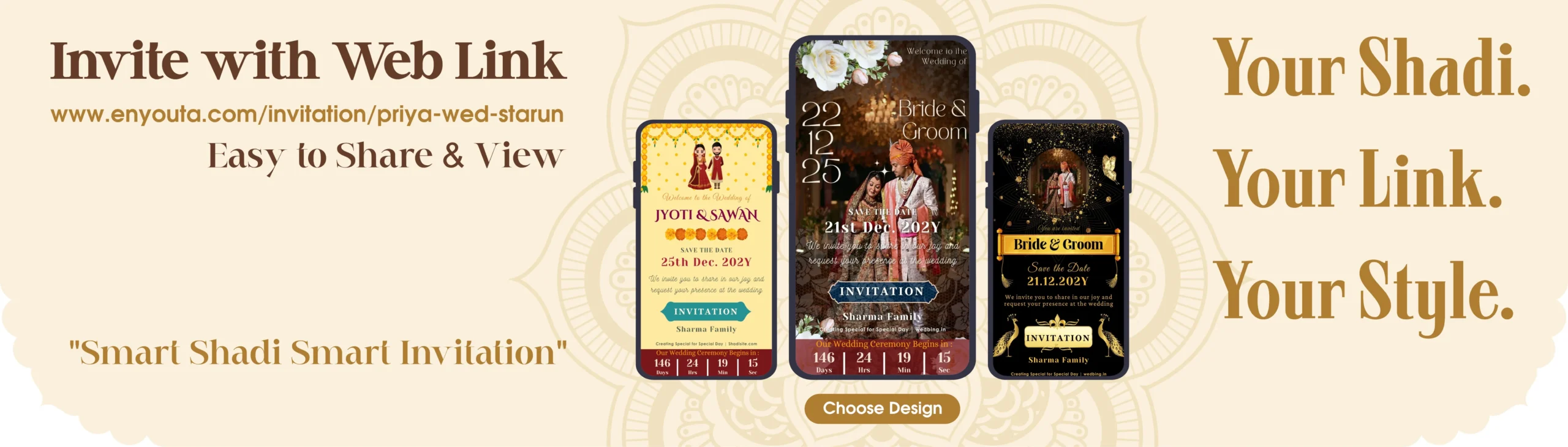 eNyouta is India’s leading destination for digital wedding invitations, event invitations, wedding itineraries, wedding timelines, days-to-go cards, pre-wedding manuhar, save the date designs, and personalized wedding stationery. We specialise in creating modern, elegant, and culturally rich digital designs that make every celebration truly unforgettable.