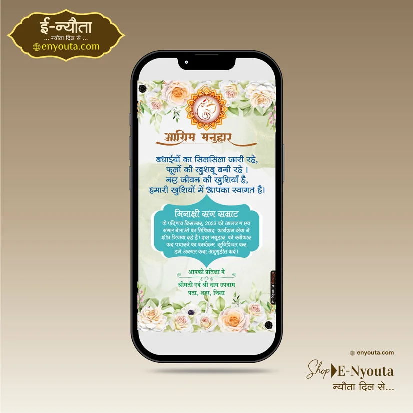 A whimsical floral themed pre wedding invite with pista green and white backdrop, an dintricate illustrations simple and elegant AGRIM MANUHAR featuring ganesha