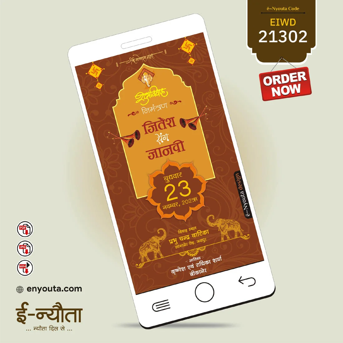 Brown wedding invitation with yellow combination and golden elephant | Design : 21302